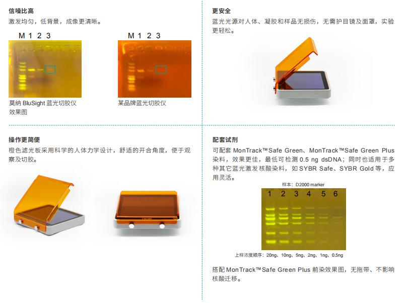 BluSight藍(lán)光切膠儀主要應(yīng)用于藍(lán)光激發(fā)的核酸染料標(biāo)記的凝膠觀察及切膠。采用科學(xué)的人體力學(xué)設(shè)計(jì),舒適的開合角度,使得切膠觀察更輕松。藍(lán)光光源保護(hù)樣品更保護(hù)操作者安全,可配套莫納安全核酸染料使用,也適配多種藍(lán)光染料,應(yīng)用更靈活。體積小巧,節(jié)省空間,觀察、切膠好助手。