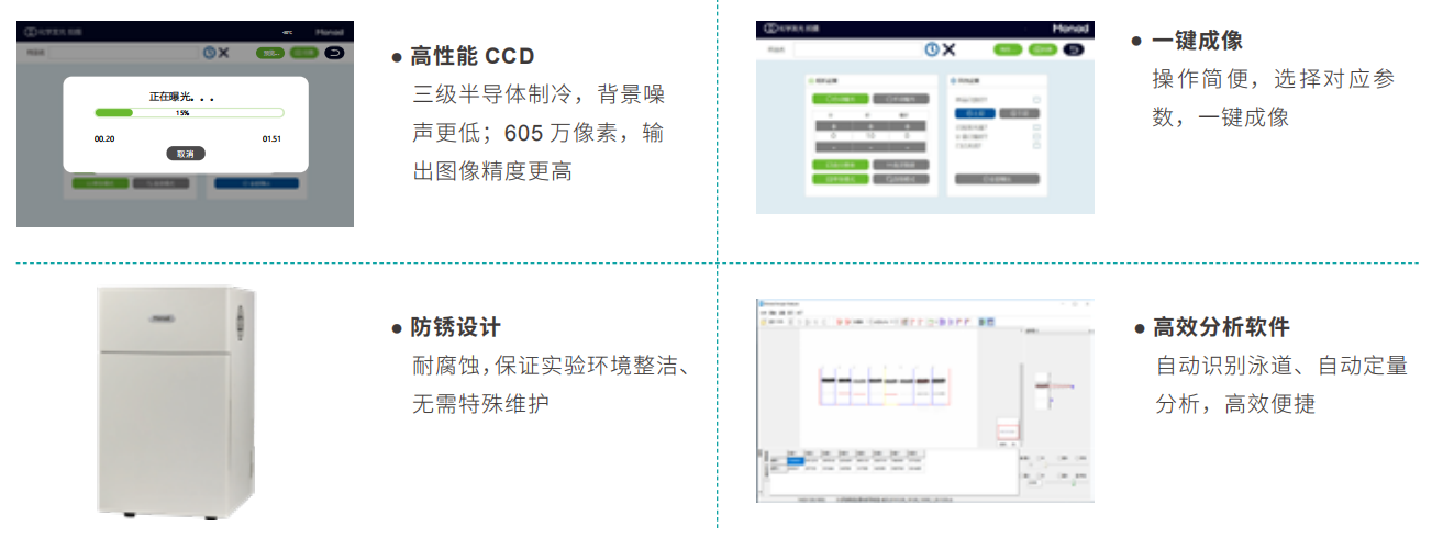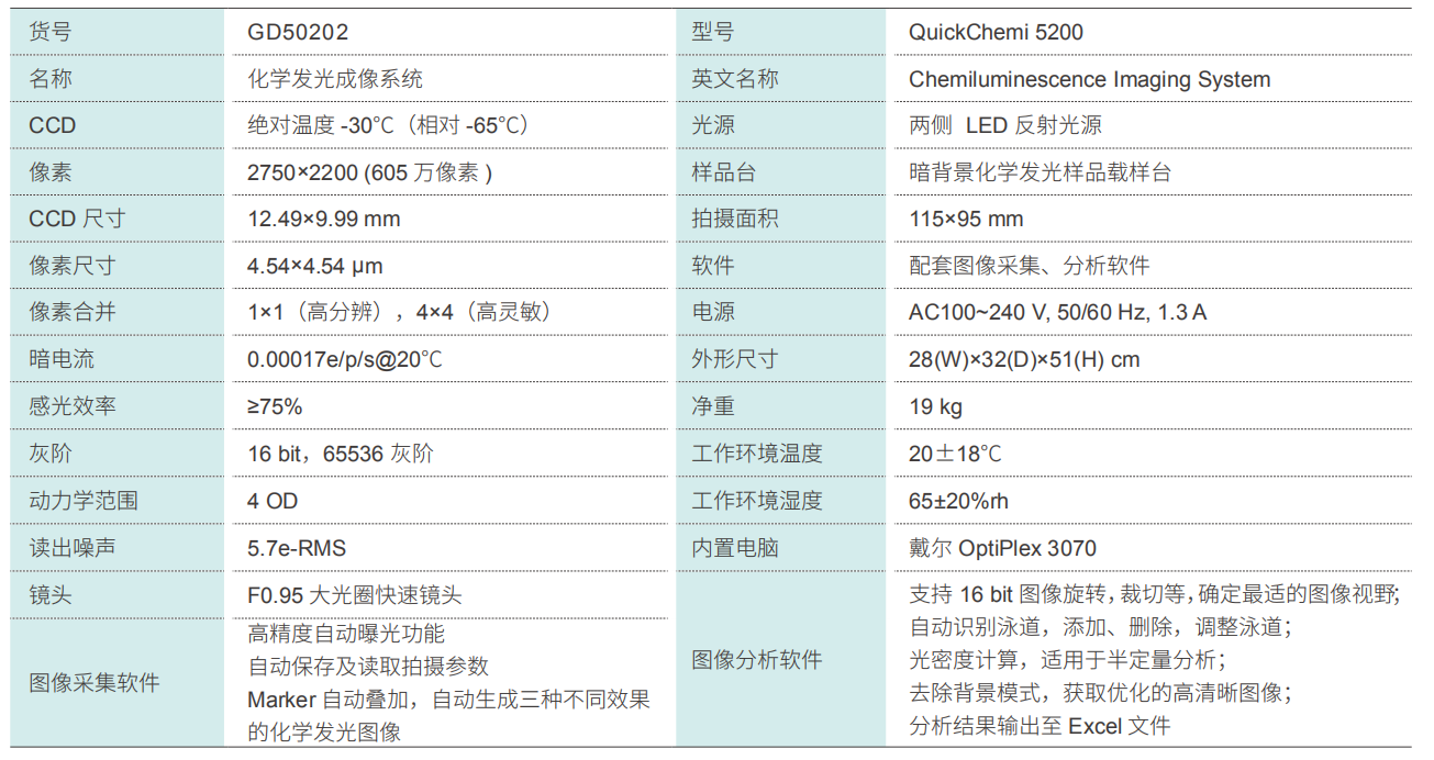Quickchemi 5200化學(xué)發(fā)光成像系統(tǒng)適用于ECL發(fā)光直接成像,采用三級深度制冷CCD作為感光芯片,最大程度降低暗電流,提高信噪比。像素值高達605萬,并具有極高感光效率,結(jié)合F0.95大光圈鏡頭,收集微弱信號能力更強,成像效果更好,速度更快,且線性范圍更寬。特殊設(shè)計的防銹機身,簡單大方耐腐蝕;外接 24 寸大屏顯示器,強大的拍攝及分析軟件,操作簡單便捷,拍攝不同信號強度樣品時,能自動匹配拍攝參數(shù),實現(xiàn)“一鍵成像”。