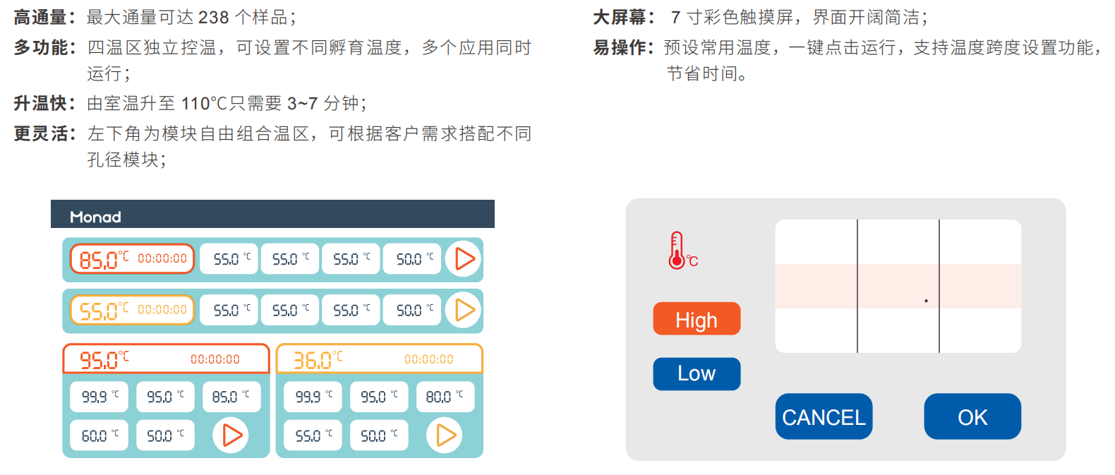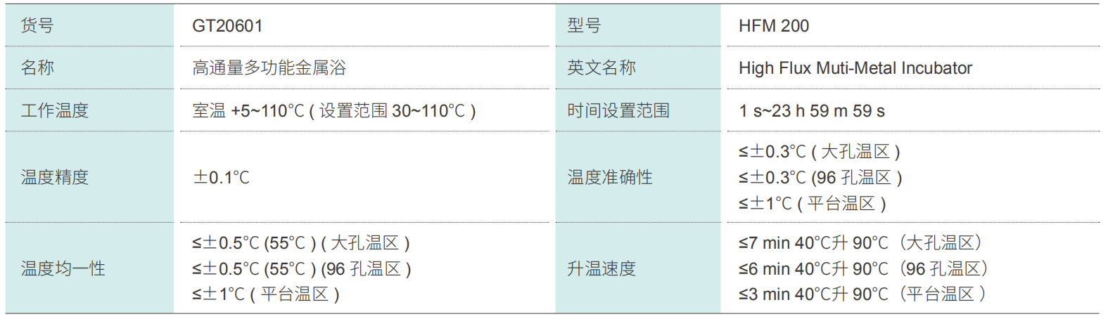 HFM 200是專用的中高溫孵育儀器,升溫速度快,溫度范圍30℃至110℃,四個溫區(qū)獨立控溫,可同時進行4 個不同溫度孵育的實驗,例如樣品的變性、酶失活及酶切等反應 均可應用此儀器。自由組合溫區(qū)面積為 8.1 cm(W) × 7.4 cm(L),可適配3個10孔0.5 ml模塊、24 孔 0.2 ml 模塊、10孔1.5 ml/2 ml 模塊或者3孔5 ml 模塊,以上模塊也可互相交叉混合搭配,以滿足客戶需求,除自由組合溫區(qū)外,另外三個溫區(qū)模塊及通量分別為 24 孔1.5 ml + 11 孔0.5 ml、24孔1.5ml + 11孔0.5 ml、96孔0.2 ml(可適配 0.2 ml 96孔板、8連管及單管),最高通量可達238個樣品。